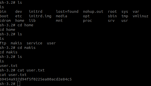 Let’s continue and find the user and root flag. When going through the user folders i found the user.txt file in /home/makis.