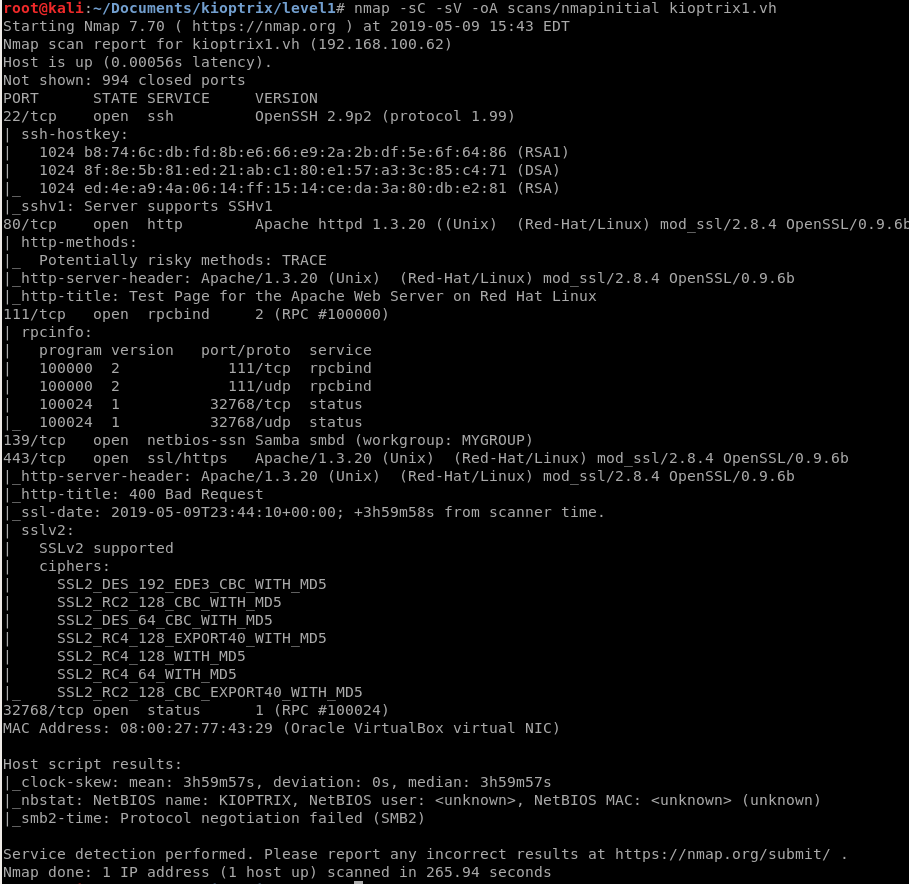 nmap -sC -sV -oA scans/nmapinitial kioptrix1.vh